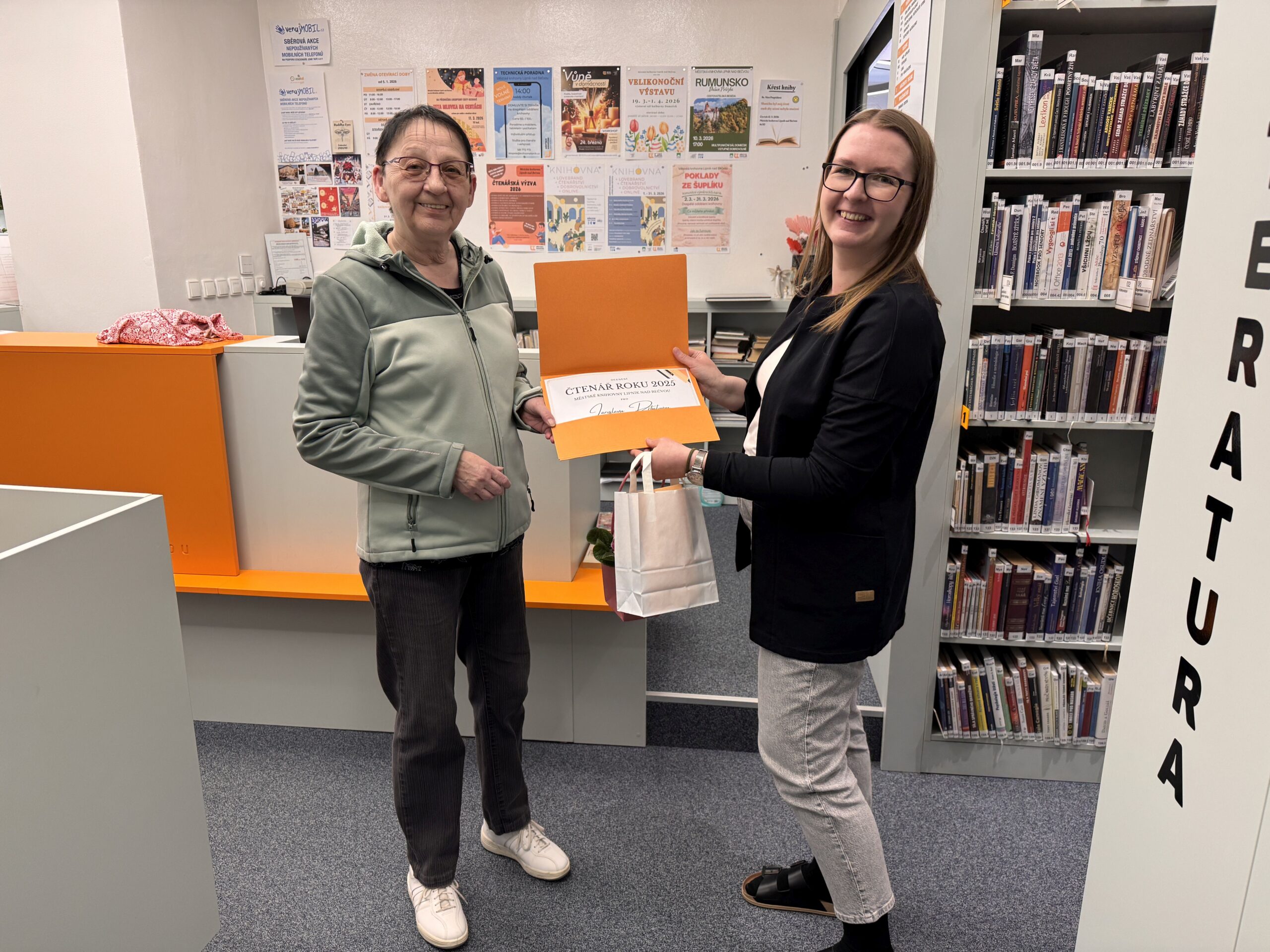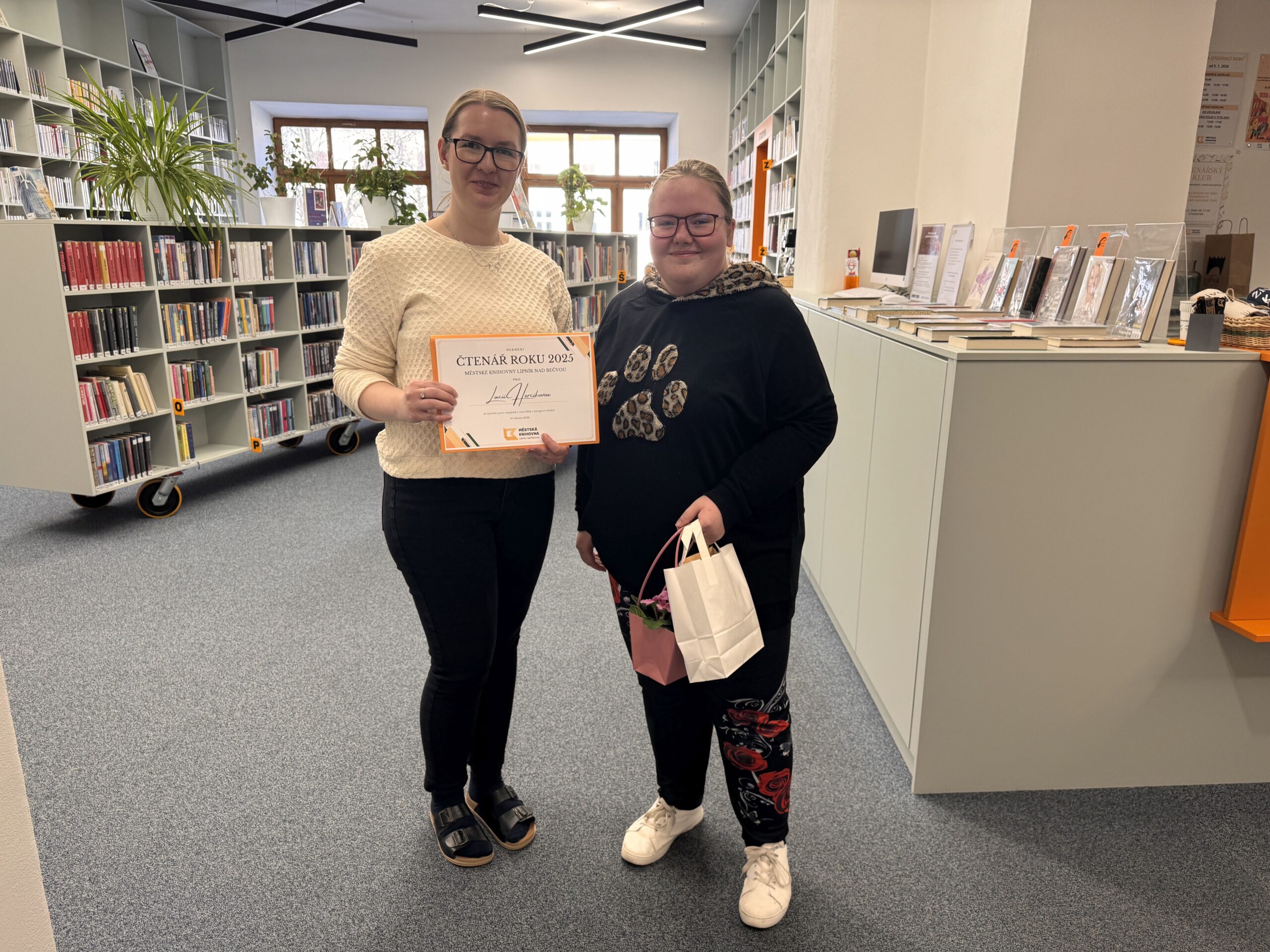 Knihovna také ocenila Čtenáře roku 2025. Letos bylo ocenění předáno hned ve třech kategoriích: dospělí, mládež a děti. Vítězní čtenáři s největším počtem výpůjček získali krásné ceny.