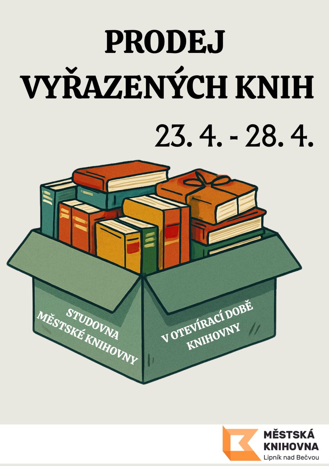 Městská knihovna Lipník nad Bečvou pořádá ve dnech 23. – 28. 4. 2026 prodej vyřazených knih. Zakoupit lze beletrii, naučnou literaturu, knihy pro děti, brožury nebo časopisy. Knihy k prodeji budou po celý týden doplňovány.